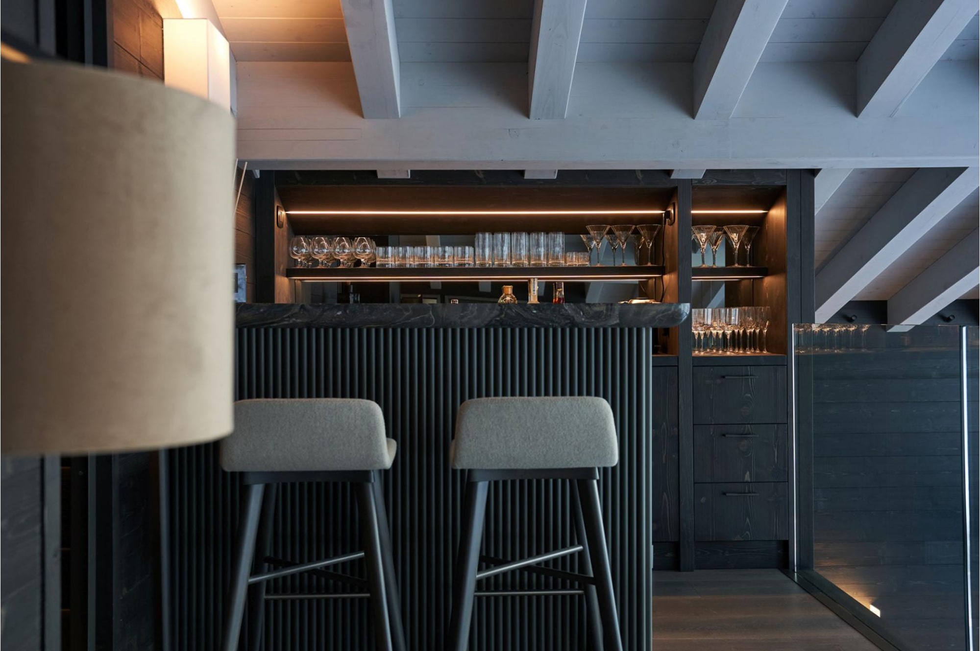 Chalet Il Gufo is a luxurious ski in ski out chalet in Cervinia, offering unparalleled views of Monte Cervino (the Matterhorn). Spread over four floors, it accommodates up to 14 guests in six fashionably modern bedroom suites. The chalet combines contemporary alpine design with cozy elegance, featuring double-height ceilings, floor-to-ceiling windows, dark wood interiors, plush furnishings, and a wood-burning fireplace. Guests can enjoy a 10 m heated indoor swimming pool, Jacuzzi hot tub, spa with steam room, a small gym, private cinema, games room, mezzanine lounge with bar, and multiple terraces and balconies. The chalet is perfect for skiing, relaxation, and family or group entertainment.