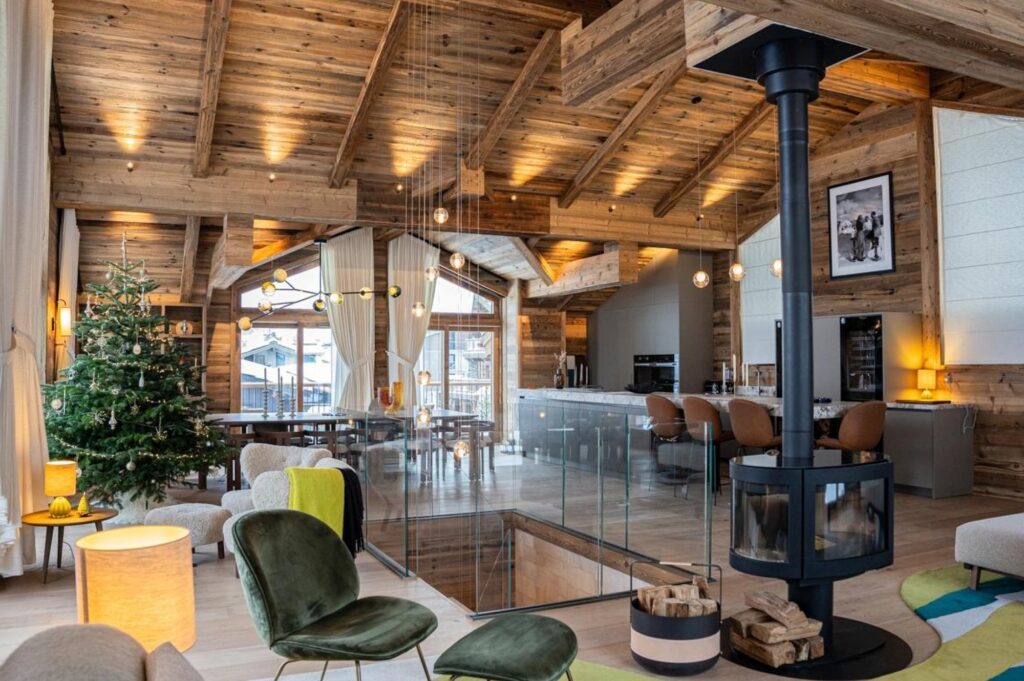 The duplex Suite-Chalet n°1, located on the 1st and 2nd floors of the Chalet-Hotel Silverstone 5*, offers 227 m² of elegant mountain living space for up to 10 guests (maximum 8 adults). With four double bedrooms, one cabin room with bunk beds, and five ensuite bathrooms, it is perfectly designed for families and friends.